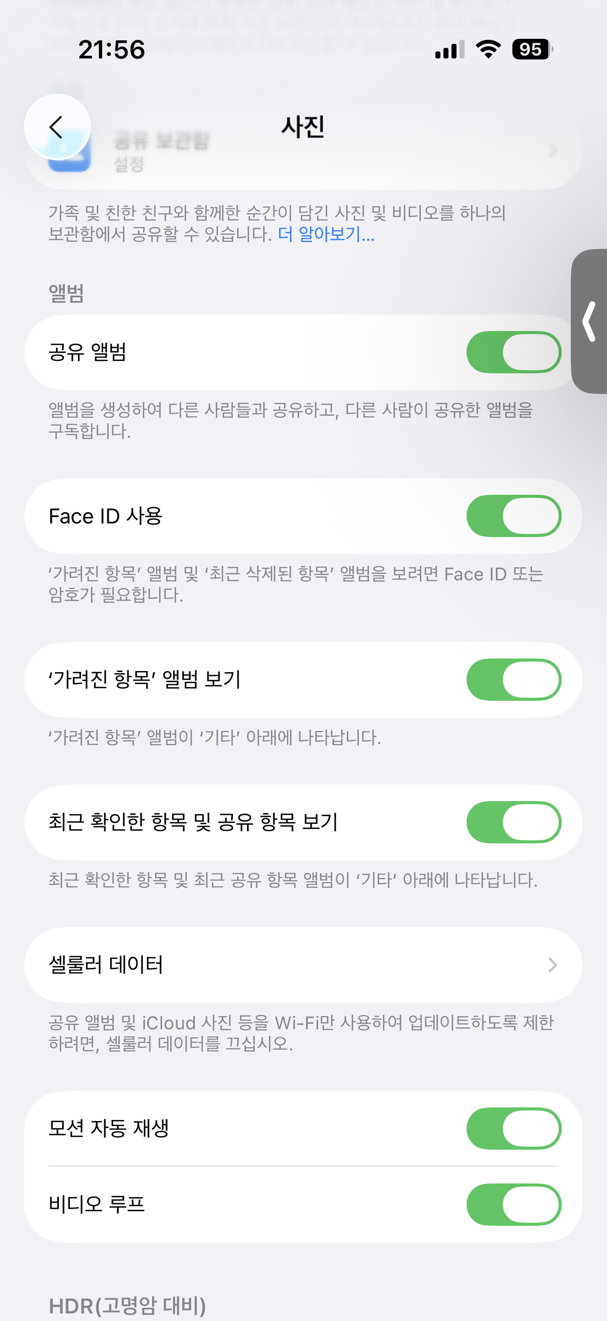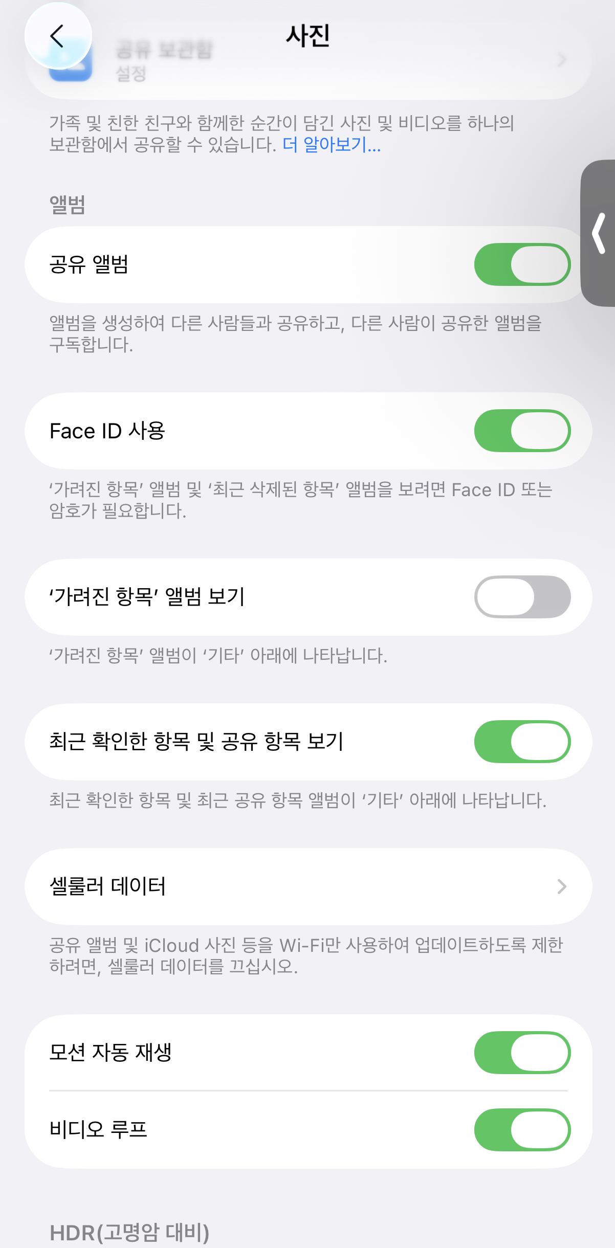 사진 앱에서 하단 메뉴를 아무리 찾아도 ‘가리기’ 폴더가 보이지 않는다면, 먼저 설정 → 사진 → “숨김 앨범 표시” 항목이 켜져 있는지 확인해야 합니다. 이 항목이 꺼져 있으면, 가리기 기능은 유지되지만 사진 앱에서는 해당 폴더가 표시되지 않습니다.